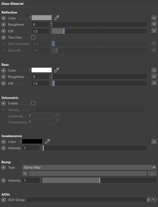 The full UI of the glass material. Only two main components: reflection and refraction, supplemented by a physically accurate thin-film interference and volumetric rendering.
