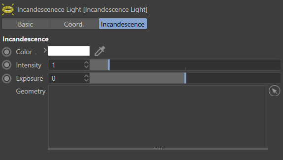 Color These parameters act as multipliers of the controlled geometry's incandescence color. The original material's Incandescence Intensity parameter will be multiplied by this value.Incandescence Light Controls
