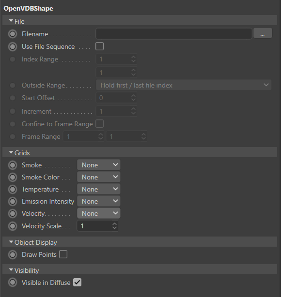 Use the browse button to select a VDB file. If the file is part of a sequence, 3Delight for Cinema4D will detect it and configure the Use File Sequence and Index Range options accordingly. Alternately, type in the Filename text field to specify the Open VDB file to use. Using the text field allows specifying expressions in place of a sequence file number, such as <f>.