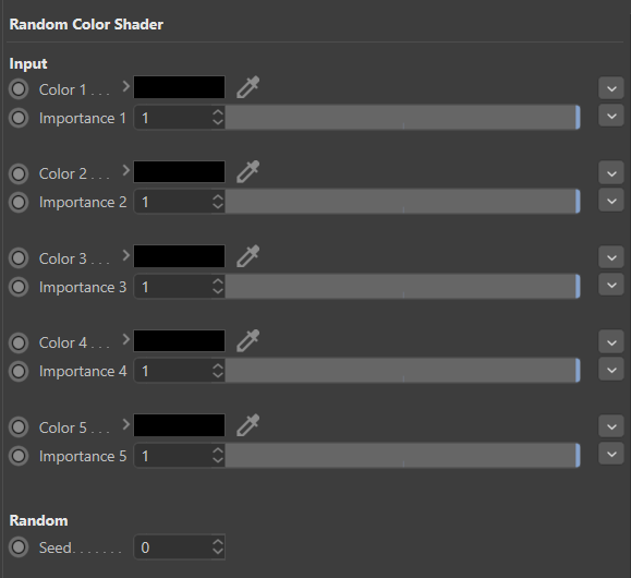 Selects one of the colour with some probability. Each importance input gives a certain probability of being selected to the corresponding color.