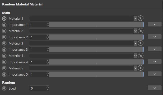 The random material allows you to randomly assign a set of five materials, with a given importance (probability), to a set of objects. This is useful to randomly assigned materials to trees, buildings, props, etc. It is possible to chain this material to assign more materials.