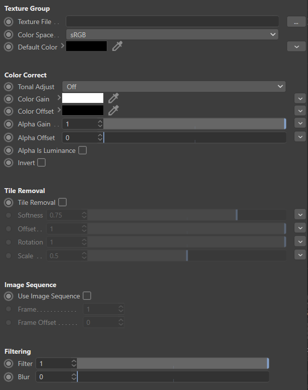 These parameters define the input texture. The default colour is applied when no texture is found or when the texture lookup is outside the UV range.
