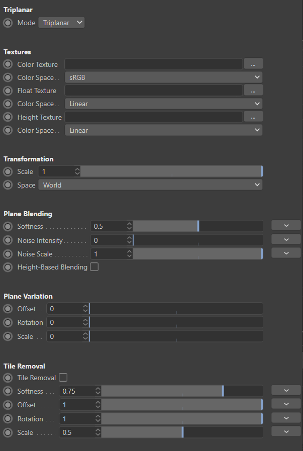 Tripplanar works by blending textures together using a special algorithm. When Height-Based Blending is Off, this parameter controls the softness of the blend. When Height-Based Blending is On, it controls the size of the region where blending occurs. Note that softness works in both blending modes (with and without height blending) as shown in the images below.,