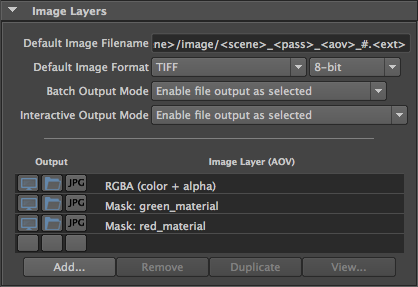As soon as a 3Delight Mask Set is created, a corresponding AOV appears in the AOV Selector in the Image Layers section of the Render Settings. In our example above, the AOV Selector would display two additional AOVs: