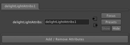 Light Attribute Nodes  are created empty; it contains no attributes at all. It is an empty container where one can add just the relevant attributes. Attributes can be added and removed using Add / Remove Attributes button, which brings up The Add / Remove Attributes Window. Right-click on the Add / Remove Attributes button instead offers the same functionality through popup menus, which are more convenient when only one attribute or attribute group needs to be added or removed.