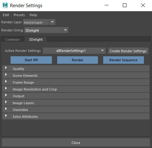 - choosing the relevant item under 3Delight → Select Render Settings.