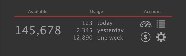 Account | The four icons are links to the user's online account at the following pages: Account Overview, Transaction History (payments and renders), Purchase Credits, Account Settings. |