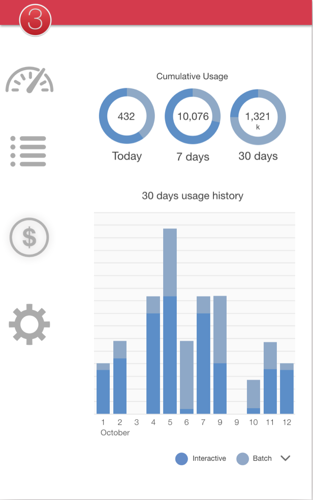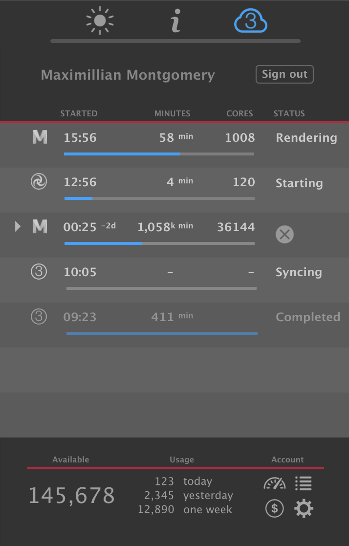 For monitoring past activities, check your account at 3Delight.com/cloud
