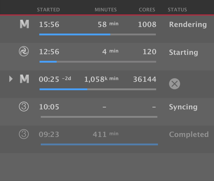 Here is a explanation of the meaning of the rendering statuses indicated in the 3Delight Cloud Dashboard (located in 3Delight Display's Sidebar).