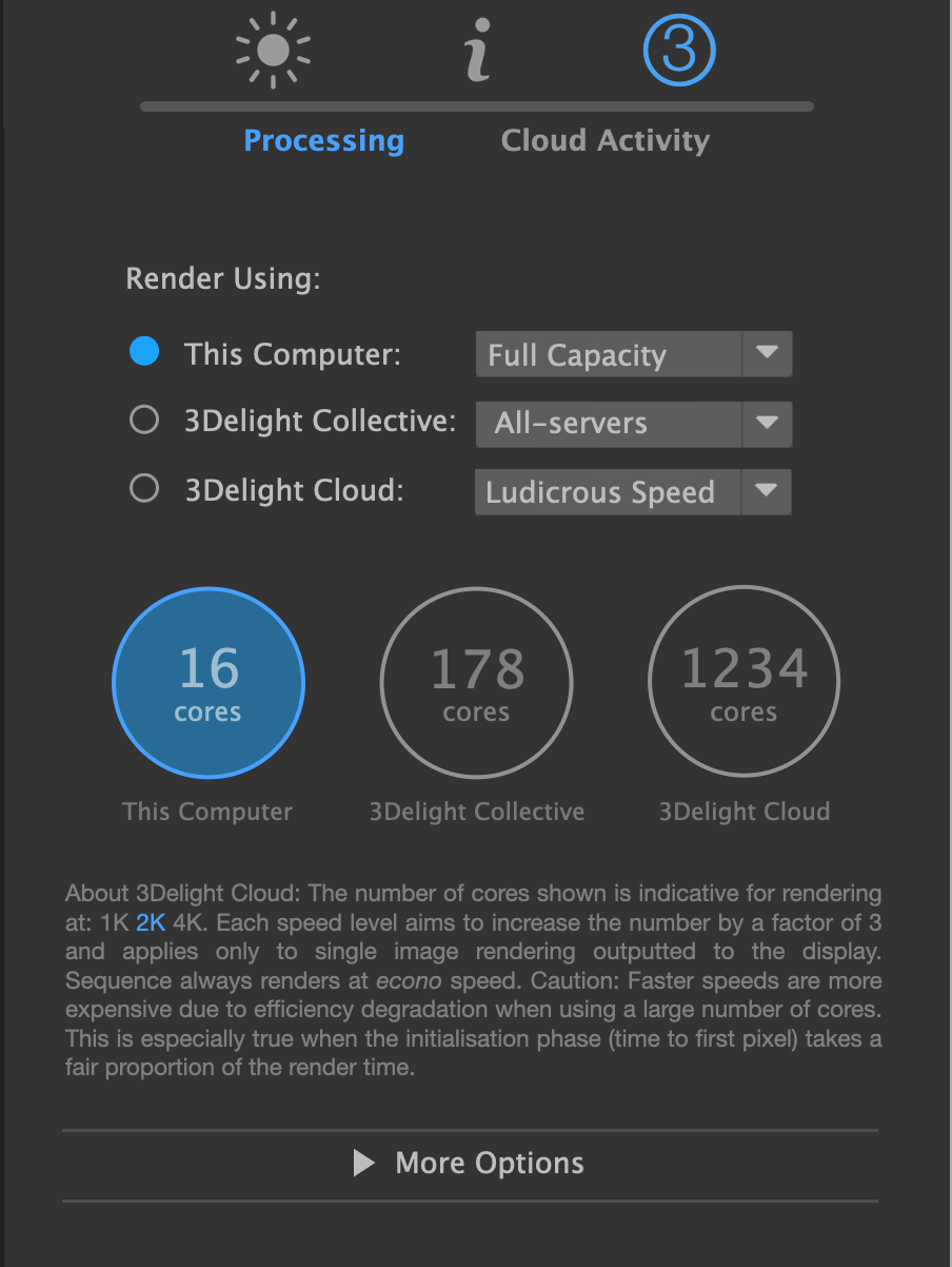 Select this option if you would like to render using 3Delight Cloud. With this option, you have four speed levels to choose from. Each level increases the number of cores by a factor of 3 from the previous one.