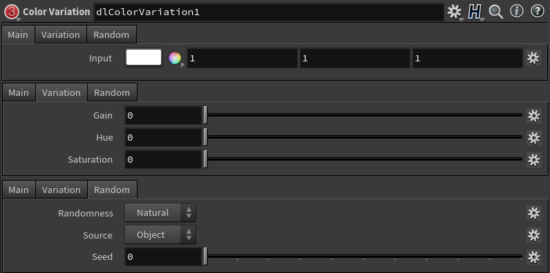 Parameter Description Input The input color on which the modifications will be applied Hue Specifies the variation range on the Hue component of the input color. For example, if the input color is HSV( 0.2, 0.1, 0.5) and this parameter is set to 0.1, then any color from HSV( 0.1, 0.1, 0.5 ) to HSV( 0.3, 0.1, 0.5) could be produced. Saturation Specifies the variation range of the Saturation component of the input color. Brightness Specifies the variation range of the Value component of the input color. Random Randomness Source Seed Allows the generation of different patterns from the same random source. The artist can try values if some pattern is not satisfactory.