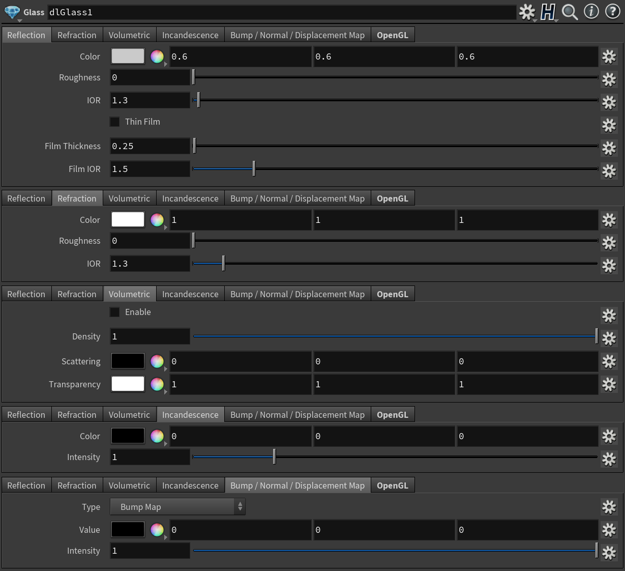 The full UI of the glass material. Only two main components: reflection and refraction, supplemented by a physically accurate thin-film interference and volumetric rendering.