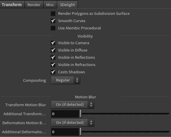 3Delight adds some attributes to Houdini's geometry and transforms. These attributes allow to conveniently toggle 3Delight features on a per-object basis. To control some of these attributes on several objects at once, please refer to Set-Based Attributes.