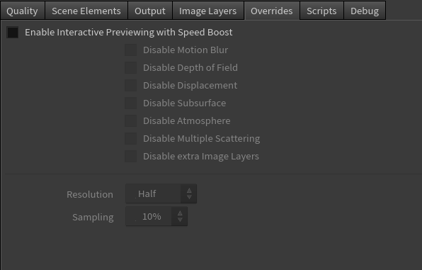 The Overrides options are handy to override some render settings in order to accelerate rendering while working interactively. Some of the most costly rendering features are made available for that purpose. Overrides can also be useful to temporary turning off some features as an investigative mesure.