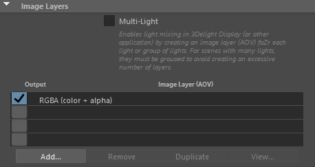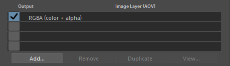 The second section of the Image Layers group is used to specify the list all the layers that will be generated during the rendering process (subject to the selected output from Output group). By default, the list is populated with only one image layer, the RGBA ("Beauty") layer. When there are many layers, it is possible to re-order them in the list for organisational purpose (to visually group them). This is done through a middle-click and drag. It is a bit finicky to use though - you need to drop the layer while a line in between two layers is highlighted for the re-order to work. If you drop the layer while another layer is highlighted, nothing happens.