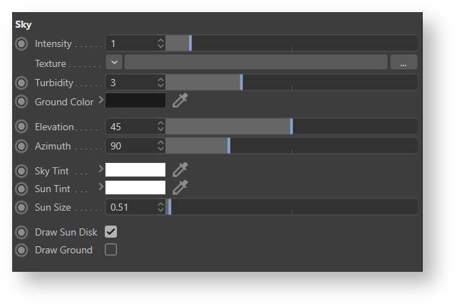 The 3Delight Sky shader is used for image-based lighting of daylight conditions. 3Delight can extract sharp shadows using this shader so that no directional light is needed to cast shadows from the sunThis shader is based on the Hosek-Wilkie sky model. It is an analytical model of the daytime sky that includes the latest improvement in this field of research. This model is able to properly picture sunsets and lighting in high turbidity environments – such as lighting during a moist day.